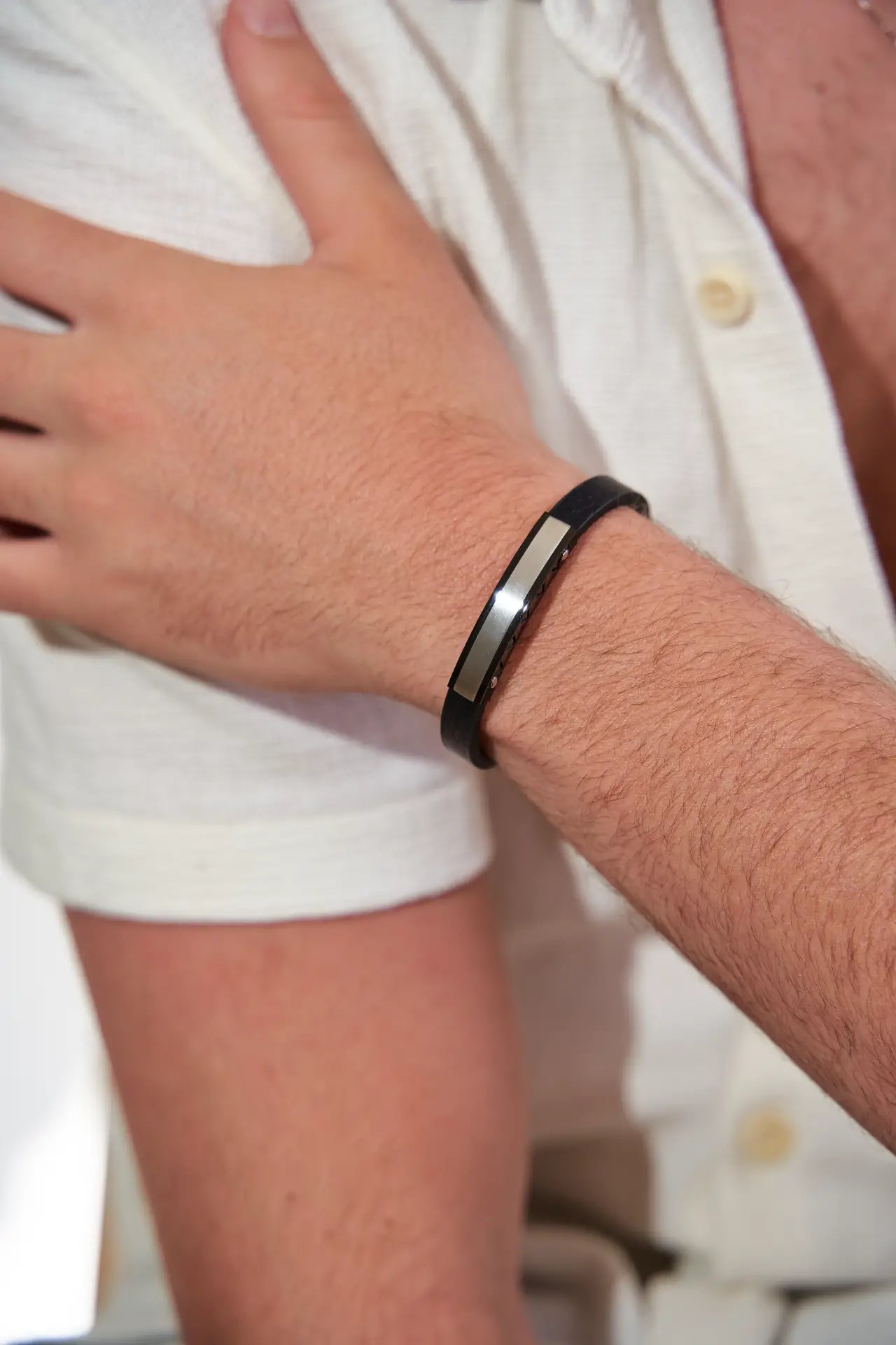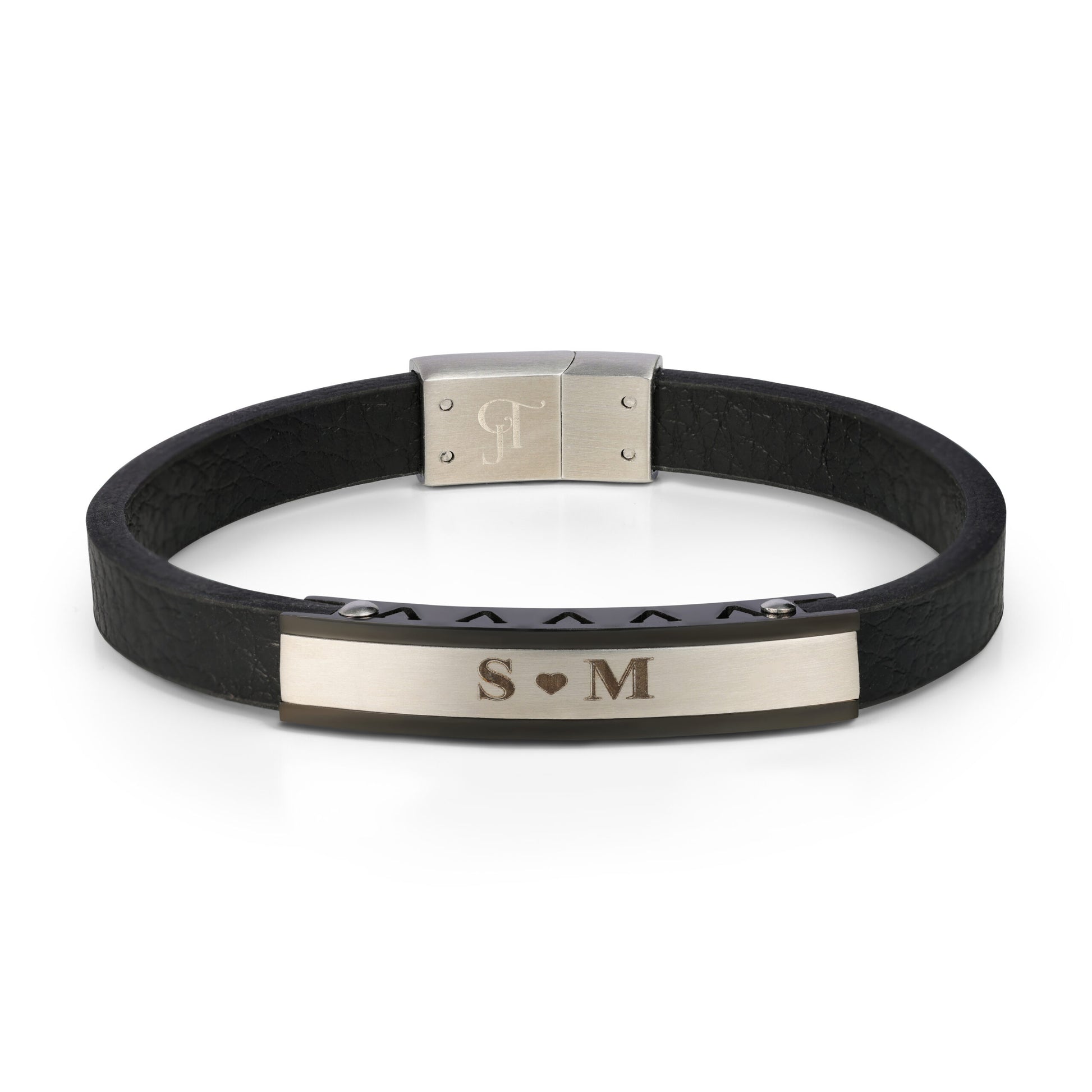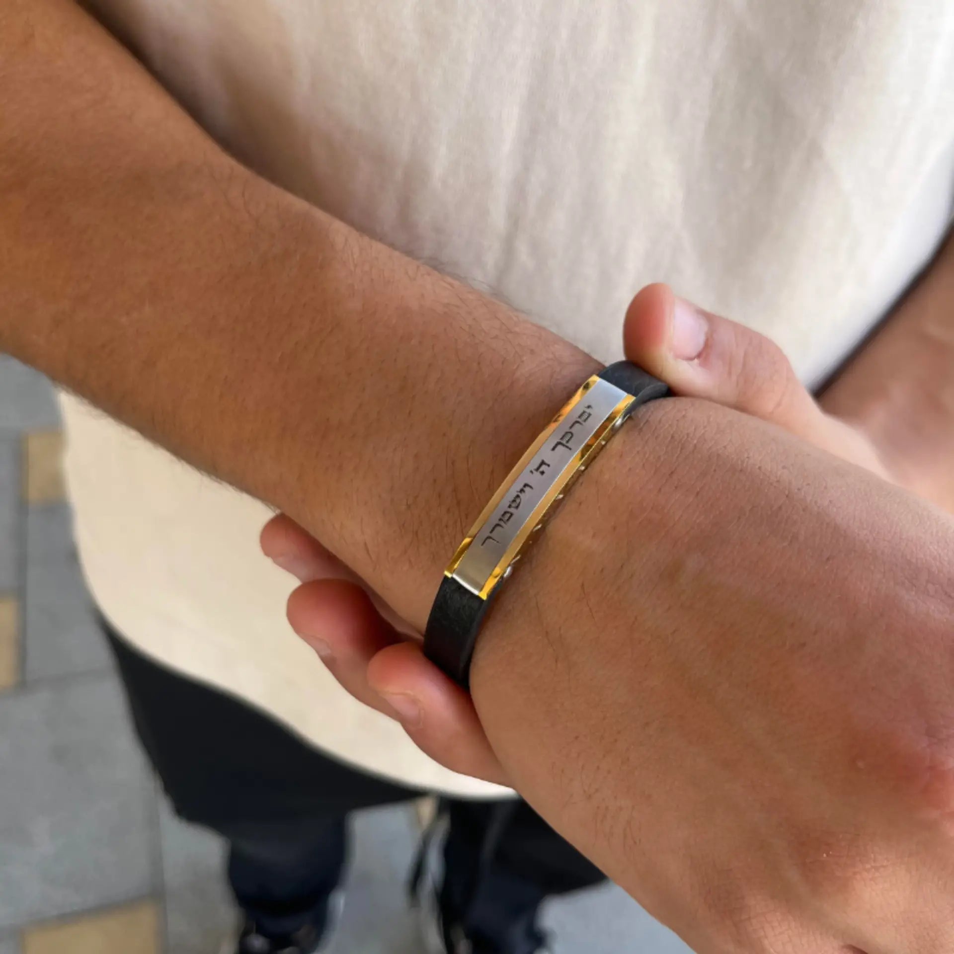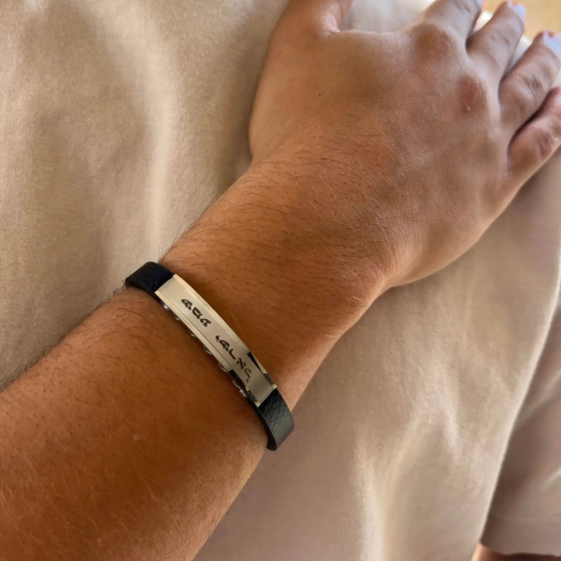 - עיצוב : הצמיד כולל פלטה קדמית חלקה המאפשרת חריטה אישית, ורצועת עור שחורה רחבה המעניקה לו מראה נועז ומודרני.