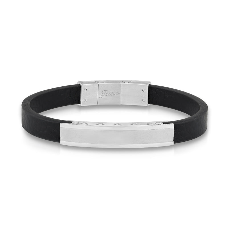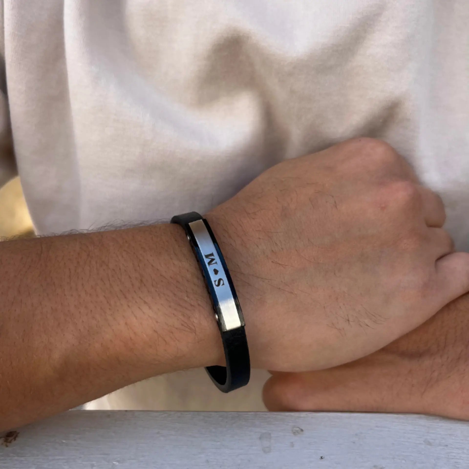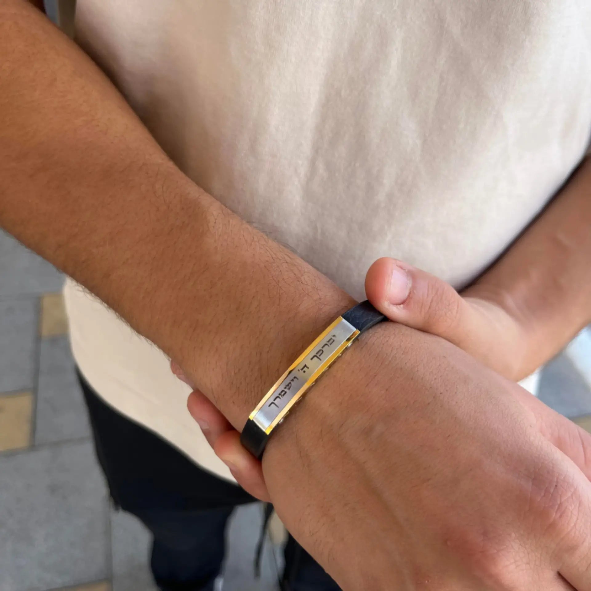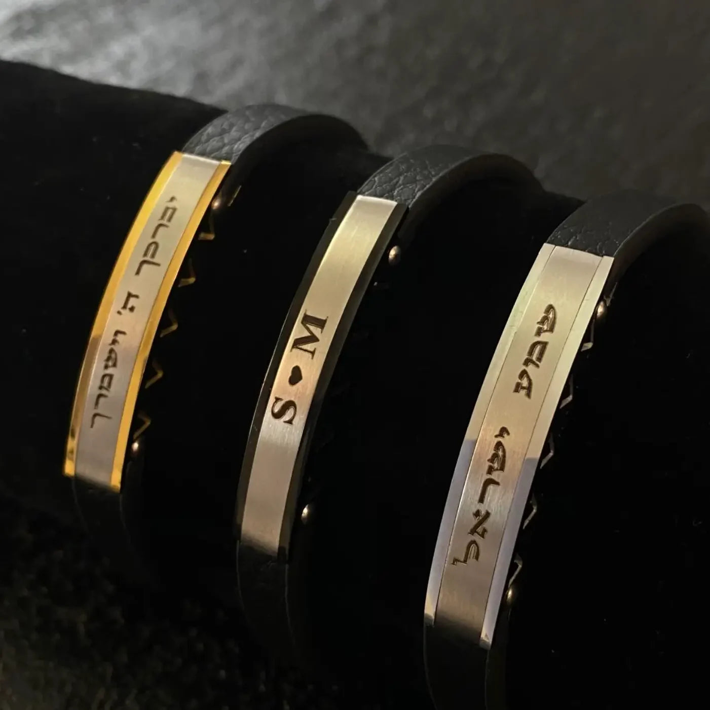 - עיצוב : הצמיד כולל פלטה קדמית חלקה המאפשרת חריטה אישית, ורצועת עור שחורה רחבה המעניקה לו מראה נועז ומודרני.